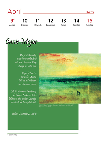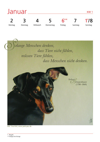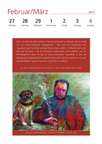 Kostenlose Beilage (eingeschweißt) : Jahreswandkalender DIN A 2 „Mit dem Hund durch das Jahr 2012“ mit Motiven von Lila Prap Monika Maron mit Hund Bruno, fotografiert von Jim Rakete, ist auf dem Titelfoto für 2012. Sie setzt die Reihe von Hundefreunden in der Literatur fort nach Titelbildern mit Robert Gernhardt, Elfriede Jelinek, Loriot, Martin Walser, Cornelia Funke und dem Ehepaar Eva Muggenthaler und Ernst Kahl. Und wieder ist wirklich Literatur drin und es ist wie in jedem Jahr erstaunlich, was alles über unseren besten Freund gesagt wird: Schopenhauer als großer Hundefreund beginnt auf dem ersten Kalenderblatt mit „Solange Menschen denken, dass Tiere nicht fühlen, müssen Tiere fühlen, dass Menschen nicht denken.“ Monika Maron meint : "Der Hund hat keinen Sinn, er ist der Sinn" Zitate, Texte, Gedichte, u.a. von: Aesop, Peter Paul Althaus, Paul Annixer, Ambrose Bierce, Clemens Brentano, Charly Chaplin, Colette, Kerstin Ekman, Heinz Erhardt, Gustave Flaubert, Robert Frost, Robert Gernhardt, Olaf Graehl, Josef Guggenmos, G. W. Hegel, Anke Höhl-Kayser, Heinrich von Kleist, Maurice Maeterlinck, Sandor Marai, Monika Maron, Pablo Neruda, K. A. Nuzum, Mori Ogai, Jean Ray, Joseph Roth, Arthur Schopenhauer, Eva Strittmatter, Ivan Turgenjew, Marc Twain, Dimitri Verhulst, Martin Walser Bilderbuchauszüge/ Bildgeschichten, u.a. von: R.S. Berner, D. Clows, V. Eggermann, N. Heidelbach, M. Huwyler, Katja Mensing, Lila Prap, Friedel Schmitz, B. Steinitz. Gemälde und Fotos u.a. von: Lovis Corinth, Rosemarie Fendel, Sigrid Harig, Jim Rakete, Hans Steinbichler, G. Laubinger, W. Turner, Tina Witt, M. van Wijk, N. Wörheide Jede Woche ist er für eine Überraschung gut. Für lesende Hundefreunde ist er inzwischen ein absolutes Muss. |